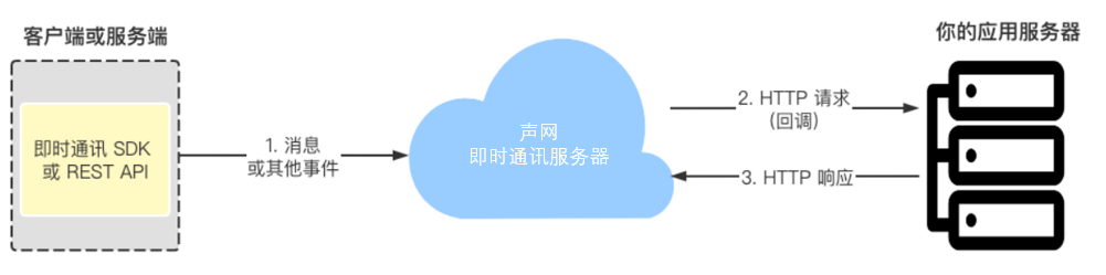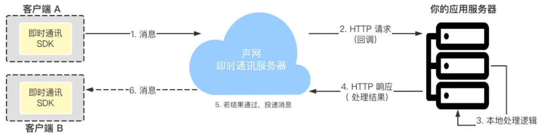 即时通讯 IM 支持 HTTP 回调(Webhook)。对你的即时通讯应用设置 HTTP 回调后,即时通讯 IM 服务器会在事件发生时通过 HTTP POST 请求向你的应用服务器发送请求。你可以根据业务需求干预事件的后续处理流程(发送前回调),或据此进行必要的数据同步(发送后回调)。