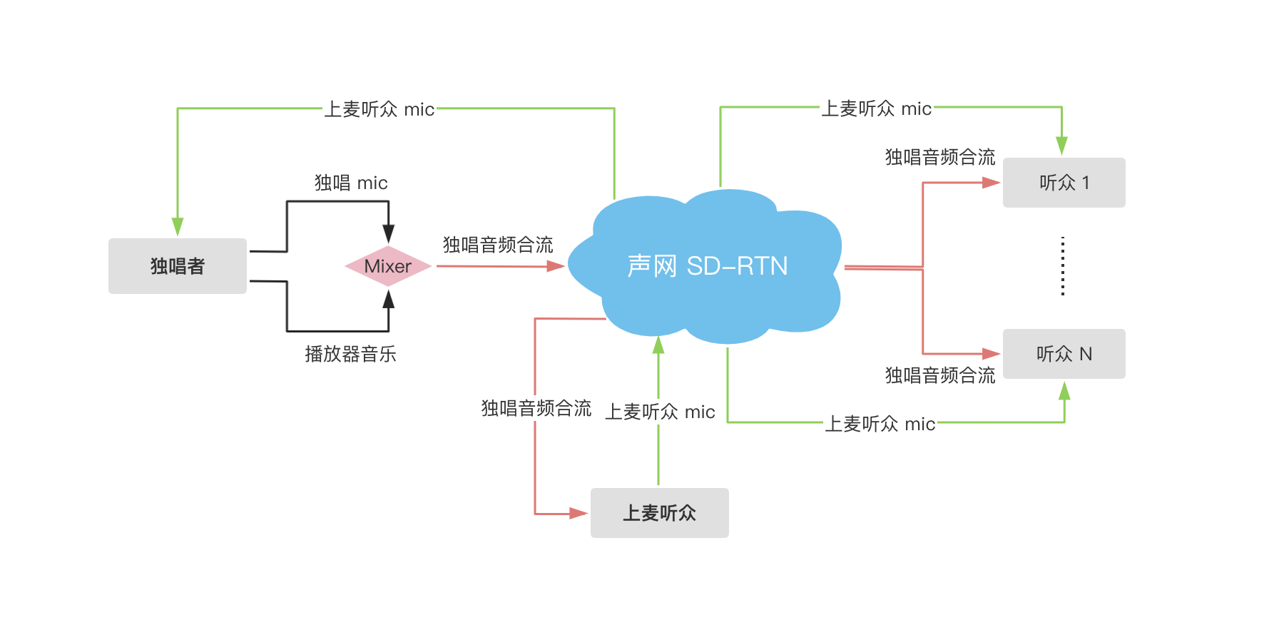 。修改角色后,SDK 默认发布该连麦听众的音频流,独唱者和其他听众都能听到连麦听众的声音。