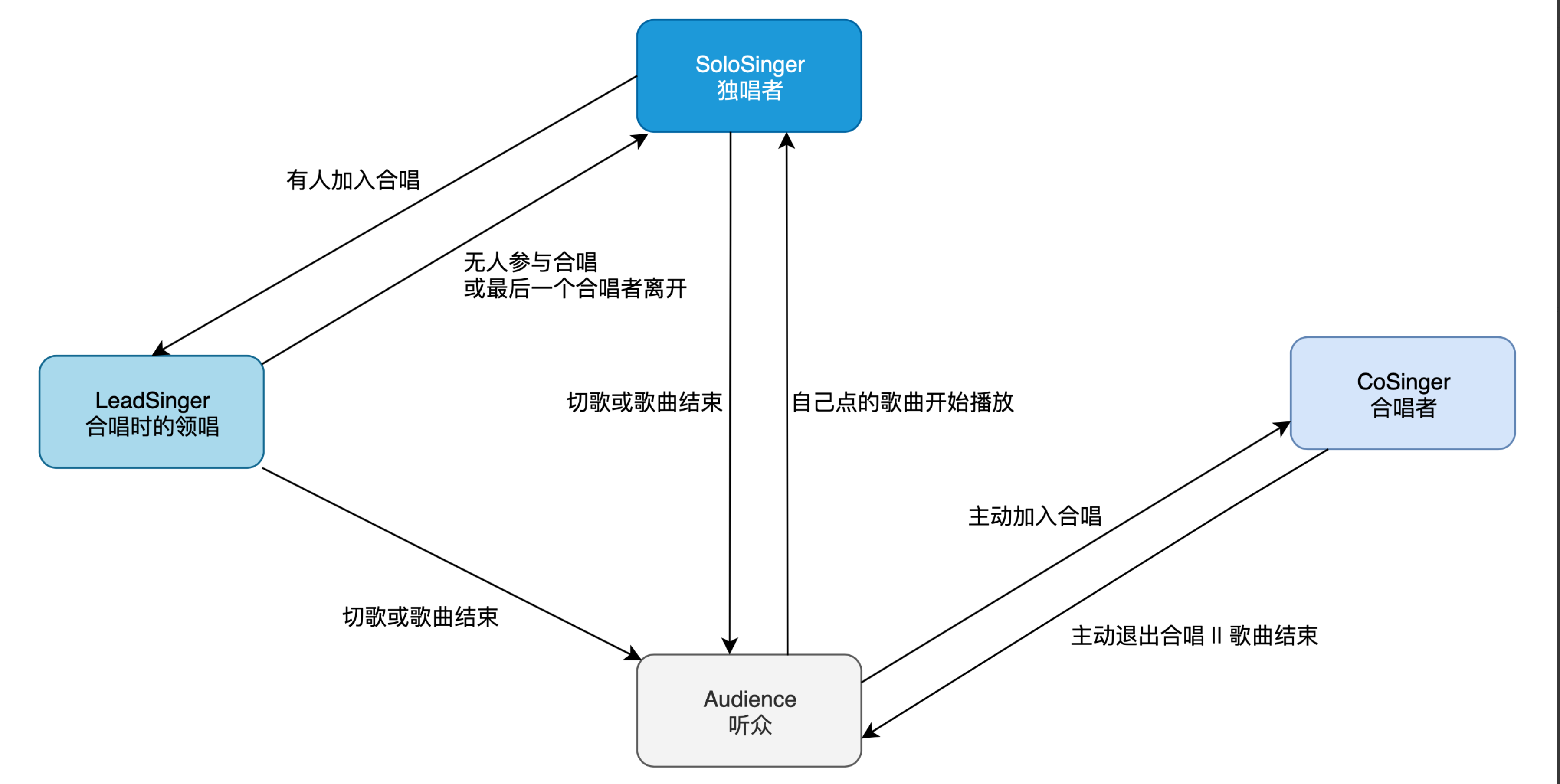 有人加入合唱成为伴唱时,独唱者需将其用户角色切换为领唱;最后一个伴唱者退出合唱时,领唱需将其用户角色切回独唱者;歌曲结束后,需将用户角色切为听众。