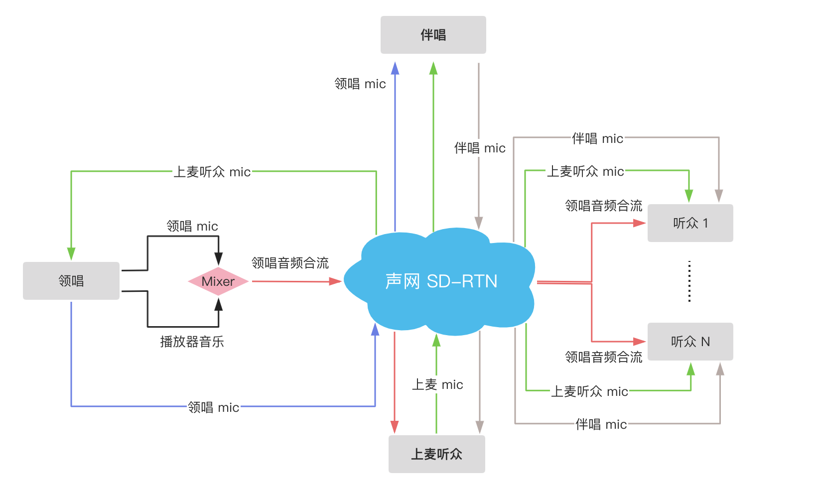 本节介绍如何实现合唱功能。独唱者点歌开唱,伴唱加入后独唱者成为领唱,K 歌房内的听众都可以听到合唱。房间内想与领唱或伴唱连麦语聊的听众可以上麦。