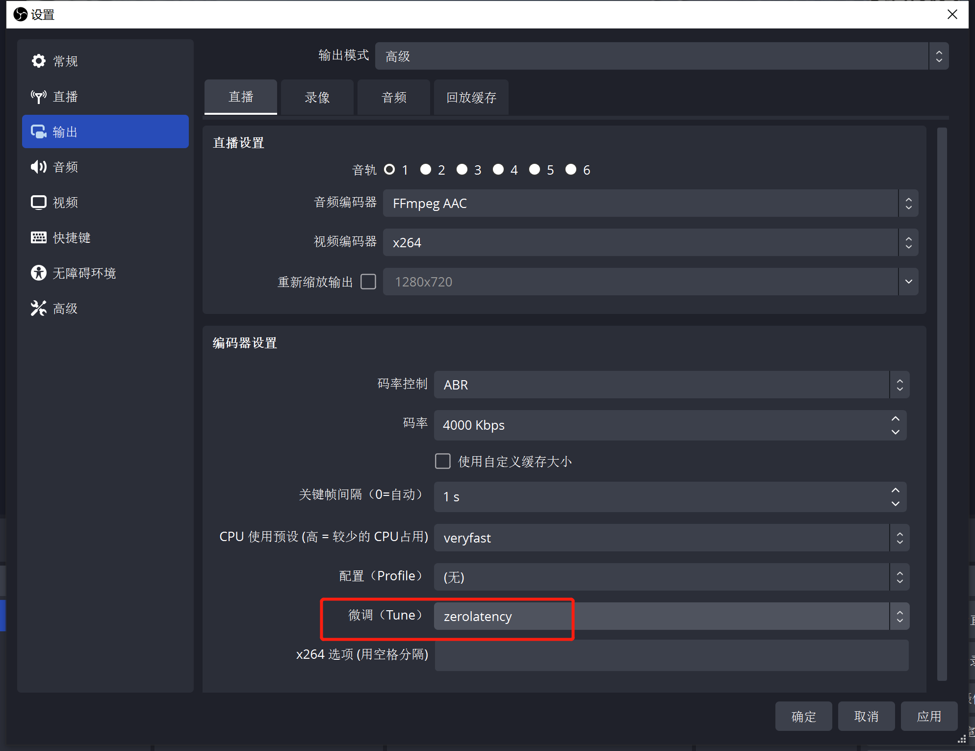 在设置 > 输出 > 直播页面的编码器设置中,将微调(Tune)设置 zerolatency