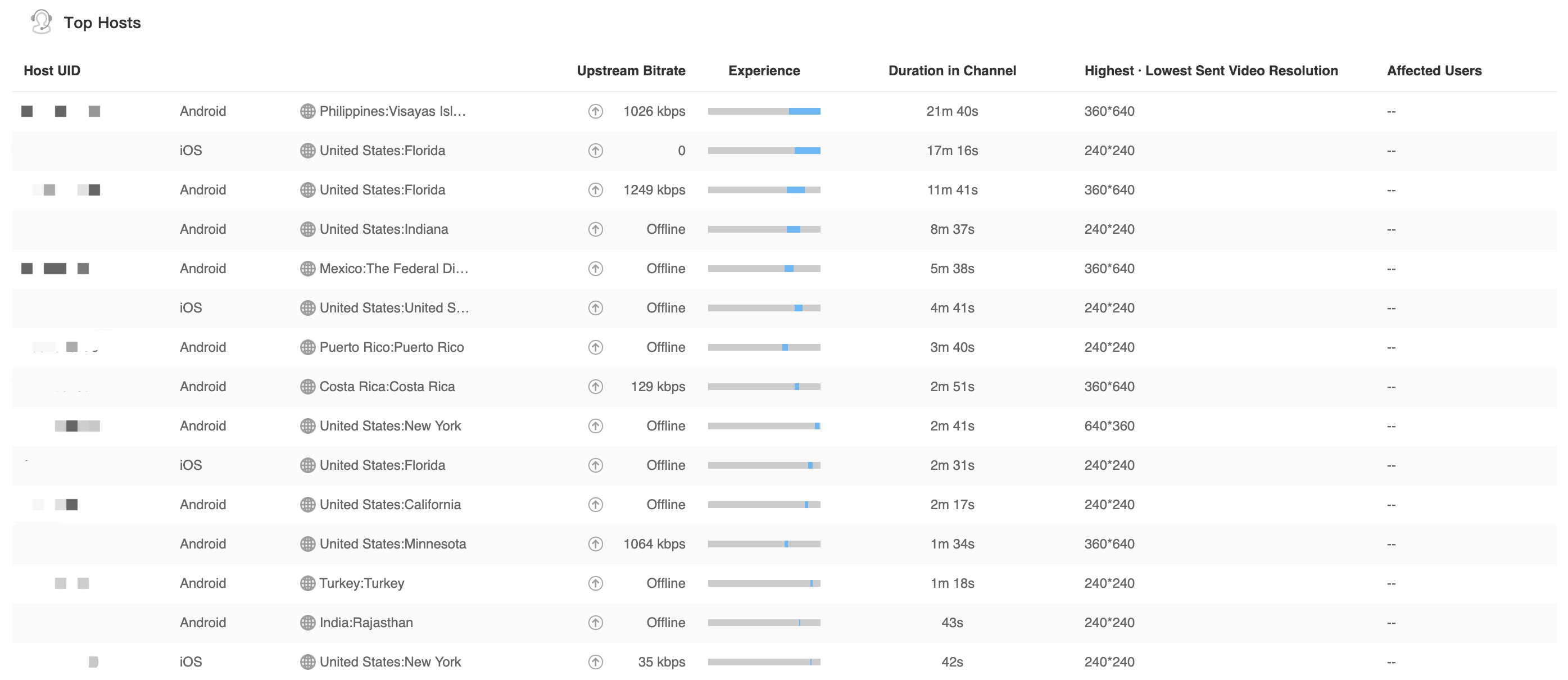 | Affected Users | The number of users having in-call quality issues, such as poor audio quality and frozen video, due to network or device issues on the host side. |