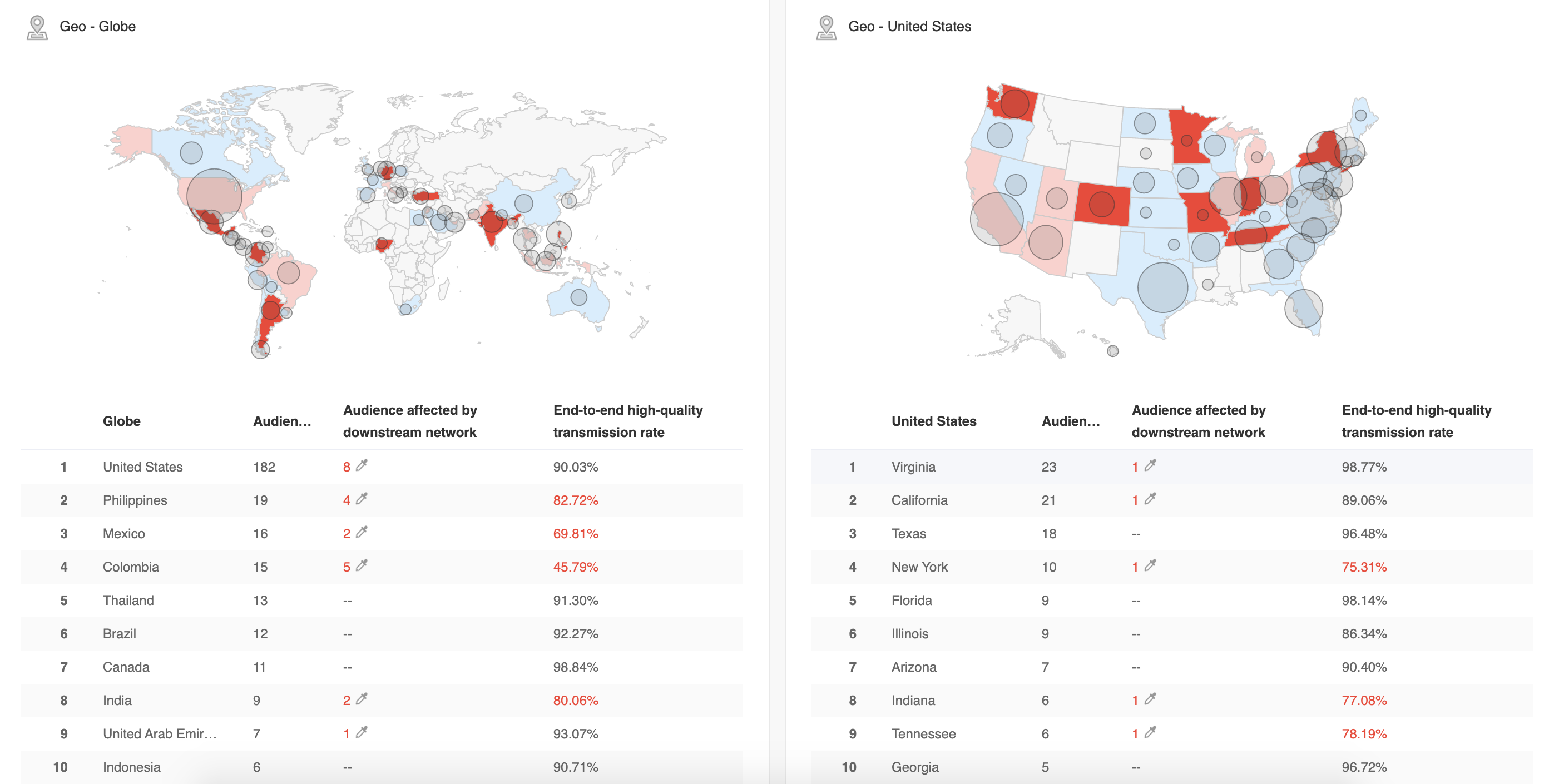 | Audience affected by downstream network issues | The number of audience members having in-call quality issues due to an unstable downstream network. The in-call quality issues include poor audio quality and frozen video. |