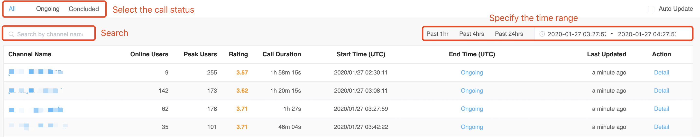 In the Big Channel list, you can view the basic information of Big Channels, such as the channel name, the number of online users, the peak number of online users, the rating and the call duration. If you check Auto Update at the top-right corner, the Big Channel list updates once per minute.