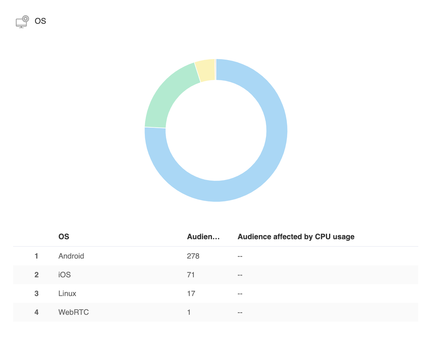 | Audience affected by CPU usage issues | The number of the audience members having in-call quality issues, such as poor audio quality and frozen video, due to high CPU usage either on the audience or host side. |