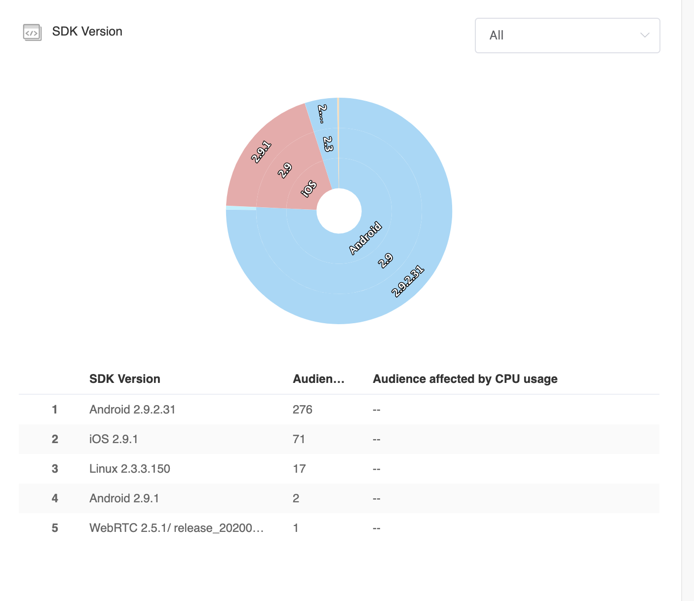 This panel shows the current/total top ten SDK versions with the highest number of audience members. In the chart, you can move your mouse on a part of the ring to check the number of audience members using the target SDK version.