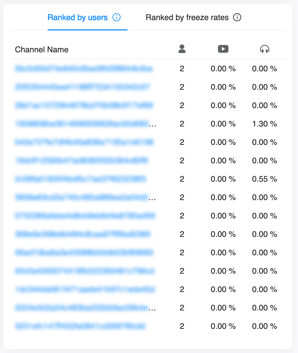 | Audio Freeze Rate | The rate at which audio freezing occurs, which equals Total audio freezing time ÷ Total audio duration. Only audio freezing longer than 200 milliseconds is counted. Audio freeze rate is not included in the quality metrics of the Agora RTC SDK for Web. That is, if you select Web RTC for product type in the global settings, the heat map chart for audio freeze rate does not display in the real-time scale panel. |