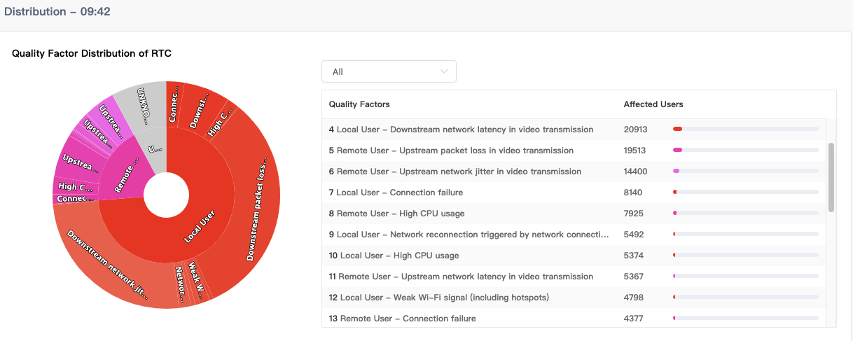 Distribution displays the distribution of communication quality factors, along with the associated scale statistics for the specified time frame. Click All to expand the drop-down menu, and choose an abnormal category to view the distribution of corresponding quality factors and affected users. For a description of quality factors, see Factor ID.