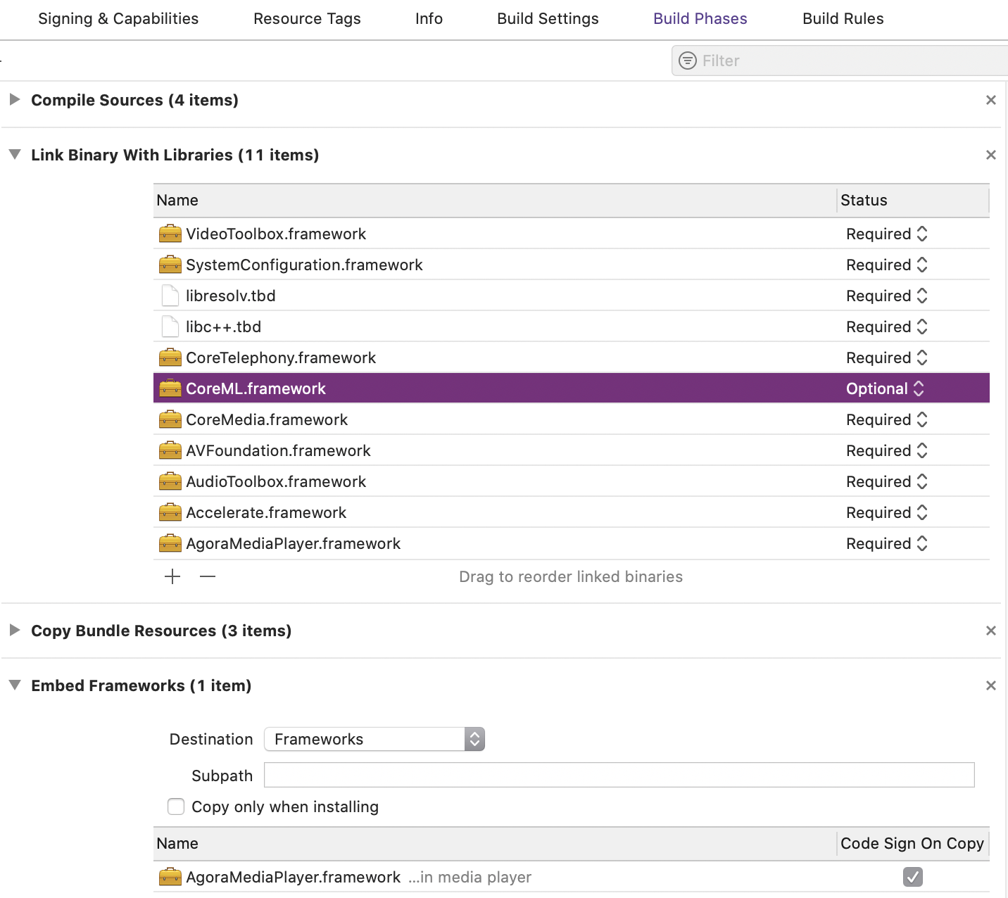 In Xcode, click TARGETS > Project Name > General > Frameworks, Libraries, and Embedded Content to change the status of AgoraMediaPlayer.framework to Embed & Sign.
