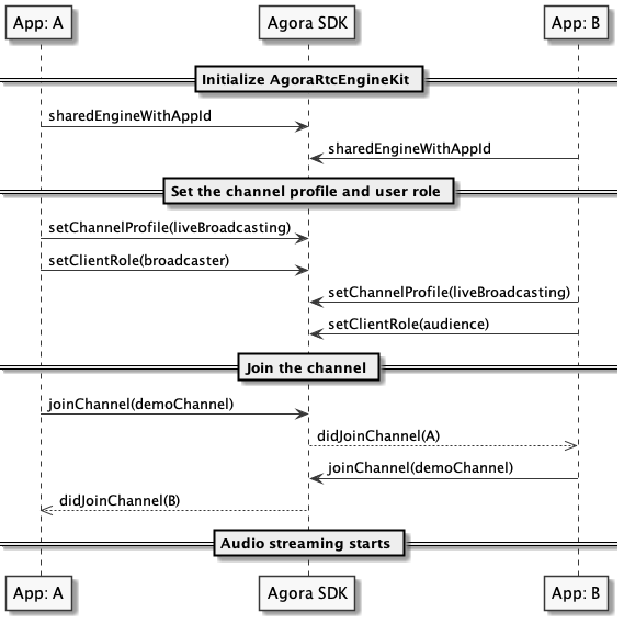 The following figure shows the API call sequence of implementing interactive live audio streaming: