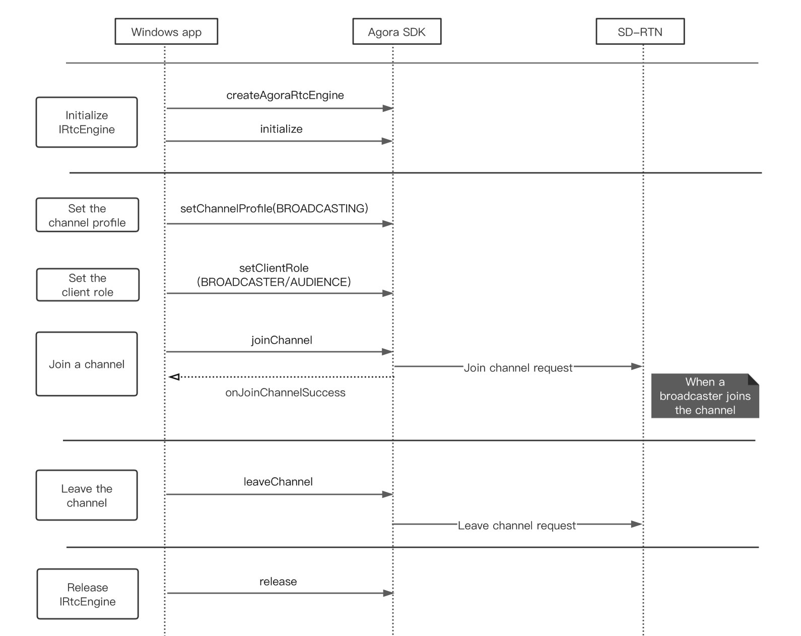You can also listen for callback events, such as when the local user joins the channel, and when the local user leaves the channel.
