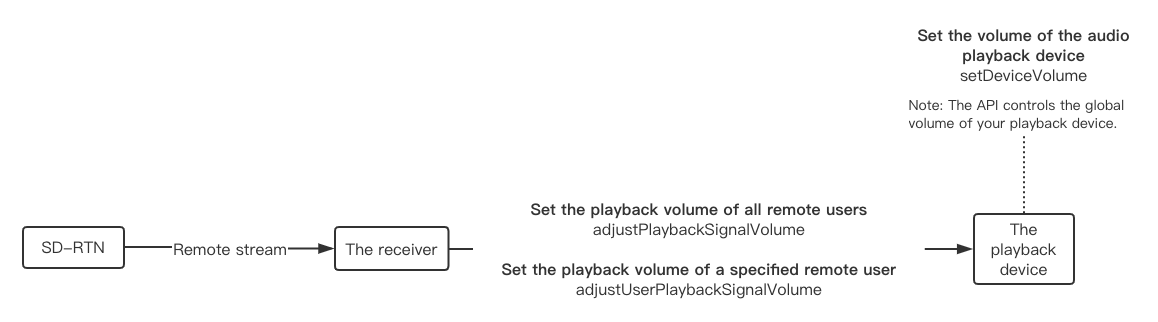 Playback is the process of playing the received audio signal on the local playback device. To adjust the playback volume, you can set the volume of the playback device, or set the volume of the audio signal.
