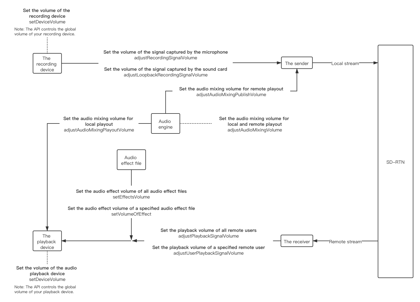 This article provides the APIs and additional information relating to audio capturing, audio mixing, and audio playback volume settings.
