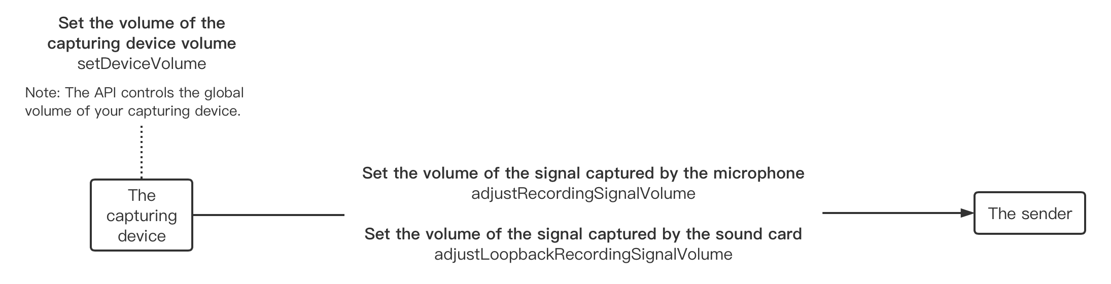 Capturing is the process of sampling audio by a capturing device and transmitting the captured signal to the sender. To adjust the capturing volume, you can set the volume of the capturing device or set the volume of the captured signal. We recommend using audio device-related APIs to adjust the capturing volume.