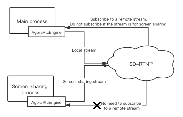 For the main process, the screen-sharing stream is equivalent to a remote user in the channel. To avoid unnecessary costs, you can exclude the screen-sharing stream when setting up the remote user view.