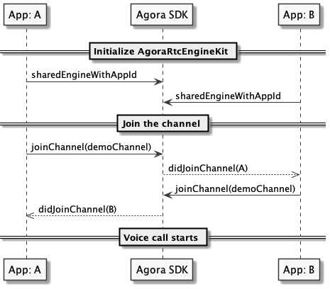 The following figure shows the workflow of a voice call implemented by the Agora SDK.